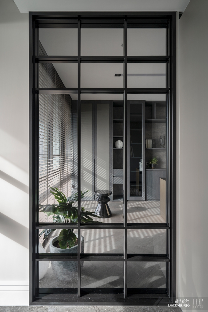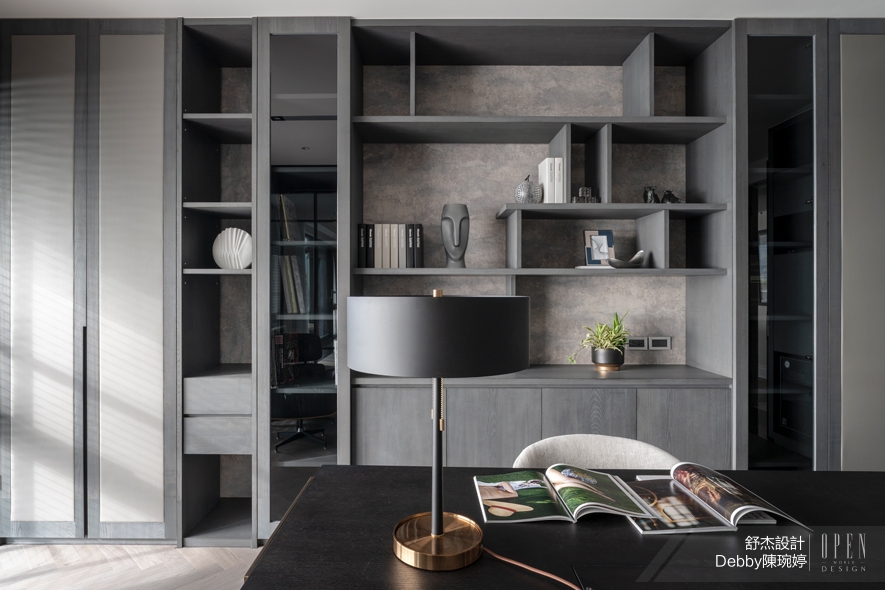 此外,書房改以深色打造,猶如濃墨重彩,與公共區域的淺色調形成絕妙對比,書櫃設計虛實的視覺交錯感,兼具展示、收納功能。團隊整合各式色調、材質,創造出低調奢華的整體氛圍,將四季的美好融入生活空間。