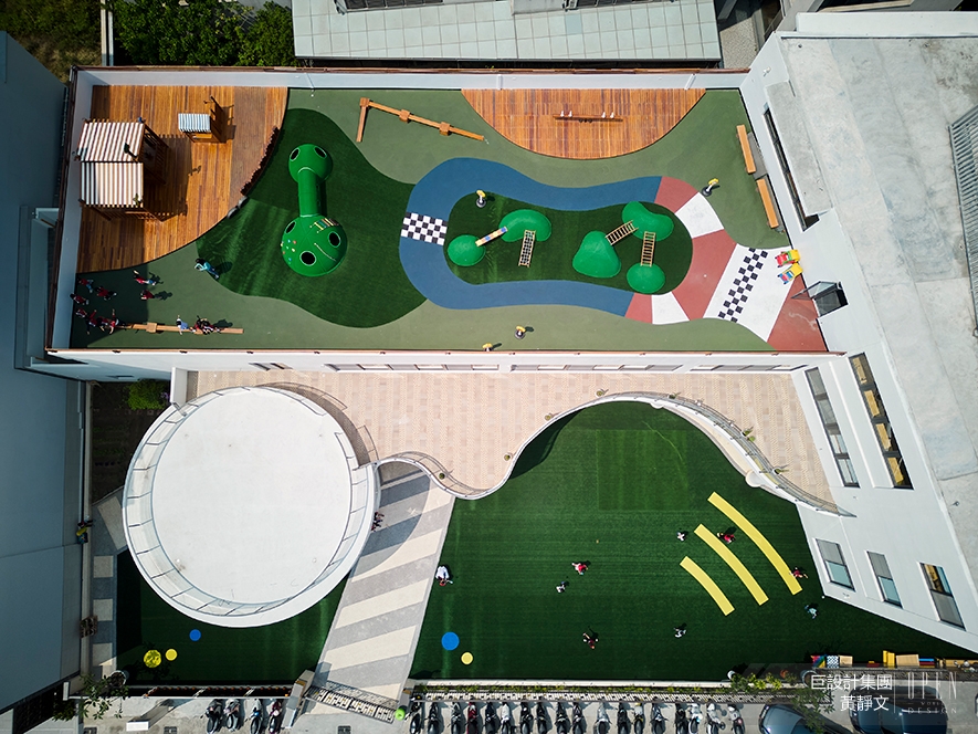▲思及幼兒園不定期舉辦活動,一樓開闊的廣場便於園方彈性使用,同時善用頂樓空間,規劃為設施豐富的遊戲場,給予孩子們一處自由跑跳的小天地。