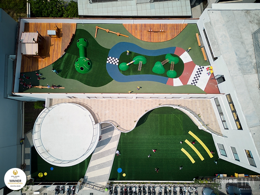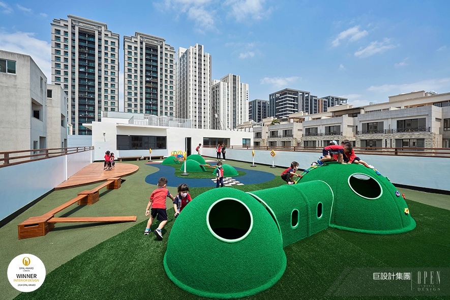 ▲思及幼兒園不定期舉辦活動,一樓開闊的廣場便於園方彈性使用,同時善用頂樓空間,規劃為設施豐富的遊戲場,給予孩子們一處自由跑跳的小天地。