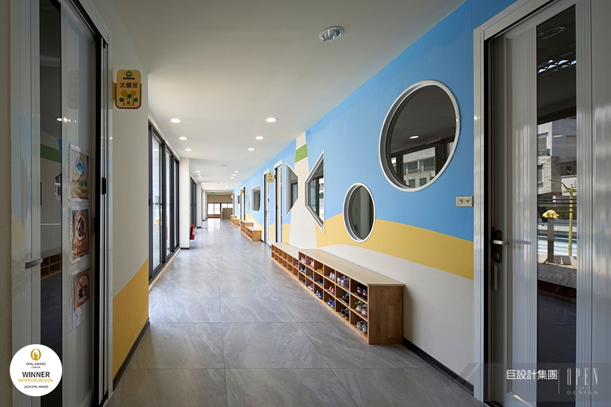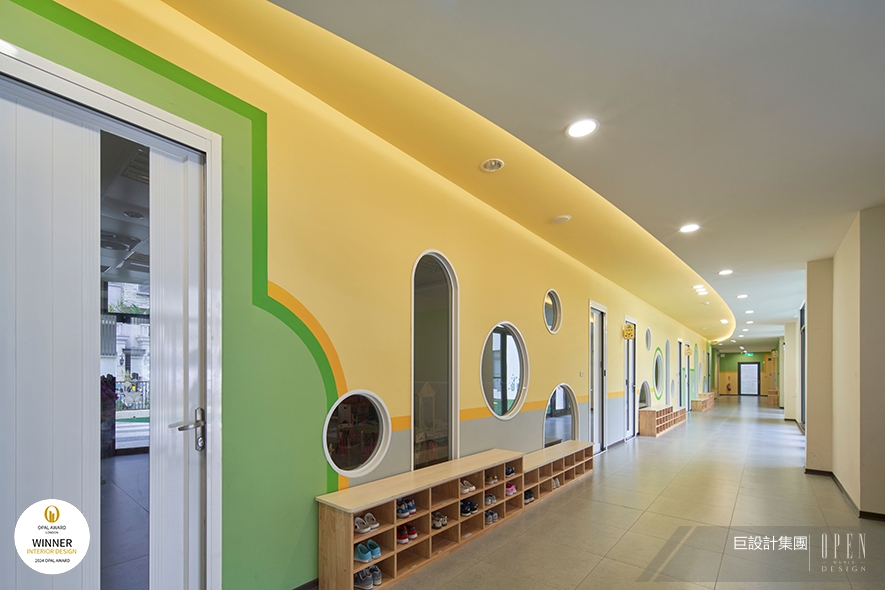 ▲走廊以繽紛色彩和弧線點綴,不僅呼應建築外觀造型,更彰顯幼兒園柔潤溫和的形象,令教學場域在自然天光、天壁柔光的托映下,呈遞輕盈和緩的氛圍。