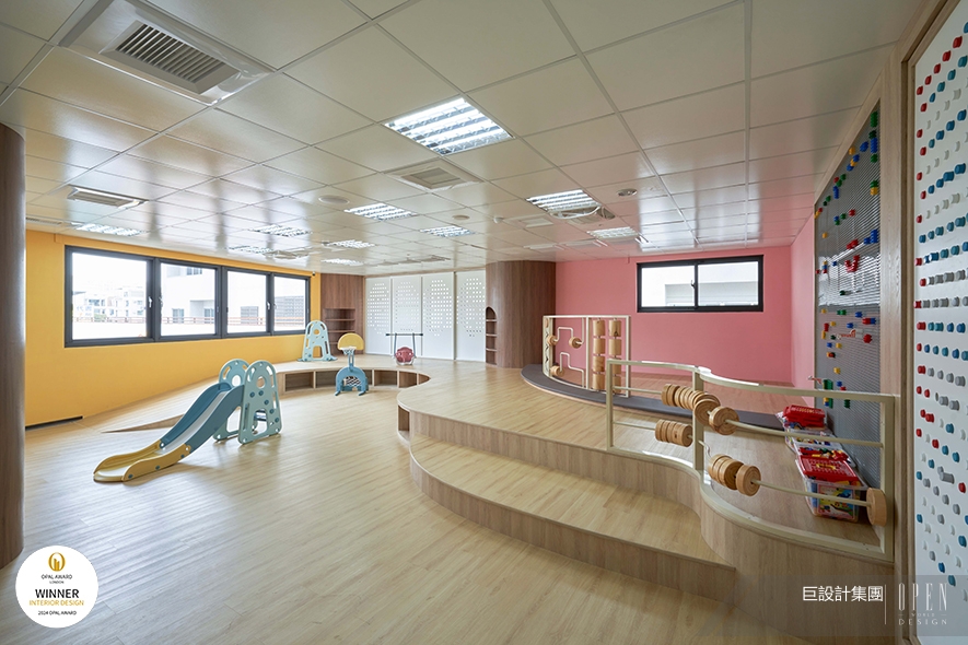 ▲室內遊戲室以流暢曲線劃出階梯及斜坡地坪,藉高低層次增添探索空間的趣味,並將益智玩具和欄杆、牆面結合,讓孩童在玩耍的過程也能激盪腦力、強化思考邏輯,達到寓教於樂的目的。