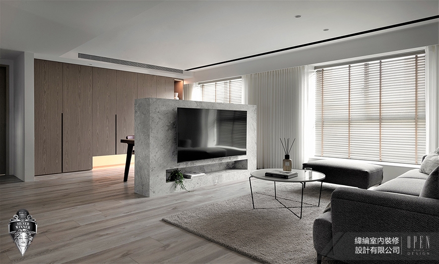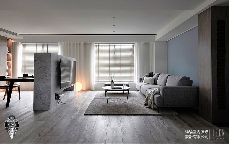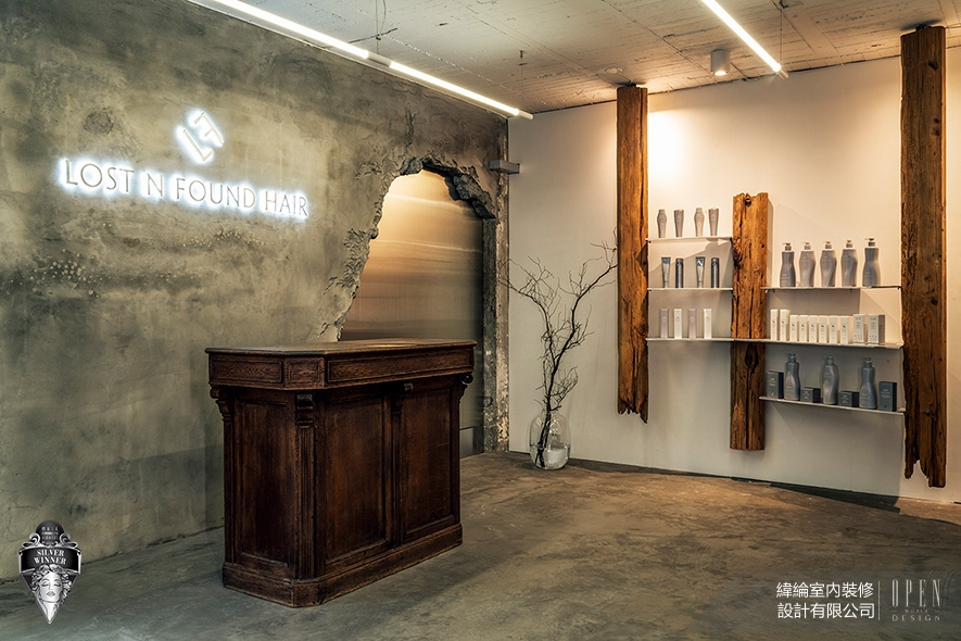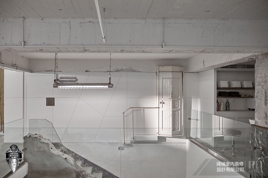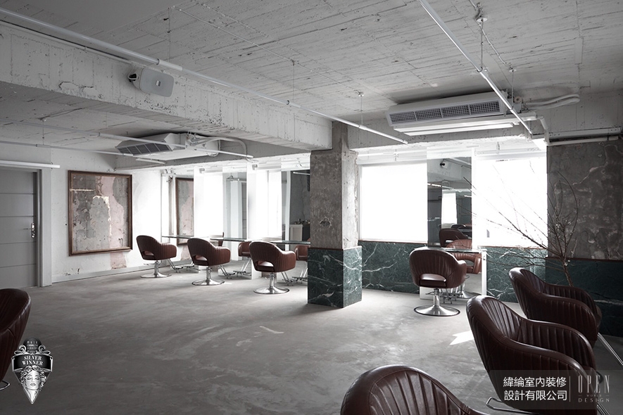 緯綸室內裝修設計有限公司 於商空《Original Texture》中,將場域原始的水泥基底保留,其上手工敲擊出的不規則輪廓,藉室外天光映顯質樸粗獷的時光痕跡,盡展髮廊業主喜愛的頹廢藝術風;另一件作品《寧然》同樣活用良好採光,搭配開放式公區中遍布簡潔明淨軟裝,營造輕盈放鬆感受。兩件樸實美作受到本屆賽事評審注目,雙雙獲取「銀獎」佳績!