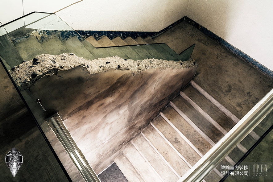 ▲以粗獷原生痕跡,偕自然敲擊後的線面,緩緩拾階而上,望向立面白牆,實則刻畫不規則線條,並增設一道復古造型門片,令空間增添趣味。
