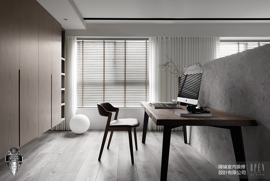 ▲書房設置外型簡潔俐落的木質桌椅,協助使用者集中在眼前事務,後方懸浮櫃滿足收納機能之餘,亦提升畫面輕盈感,柔化作業時的緊繃,保有居所盈溢的舒緩氣息。