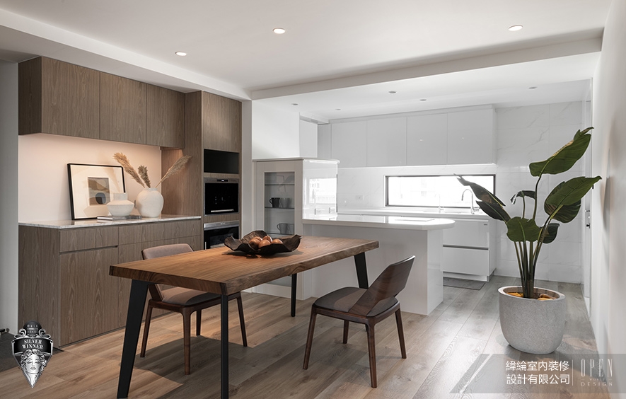 ▲用餐、料理區塊僅以素白中島做區域分隔,一體式設計讓主客相談無間,提供聯繫情感的溫潤用餐氣氛,中央深色木餐桌結合旁側淨白的島台、餐櫃,傾流乾淨明練的氣息,讓居者在炊煮飲食間享受輕快格調。