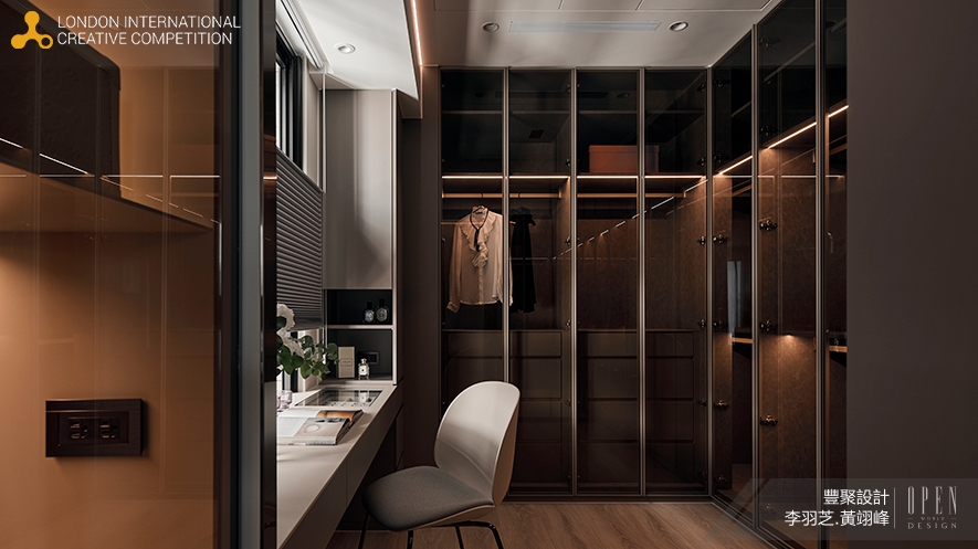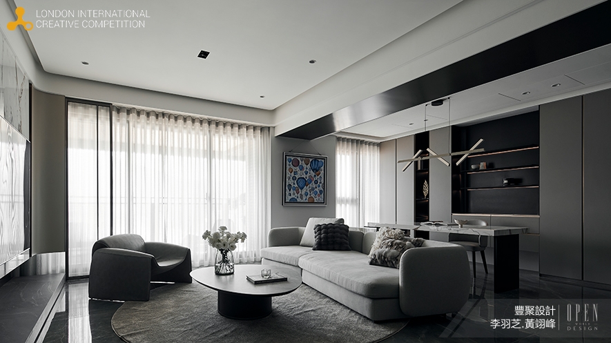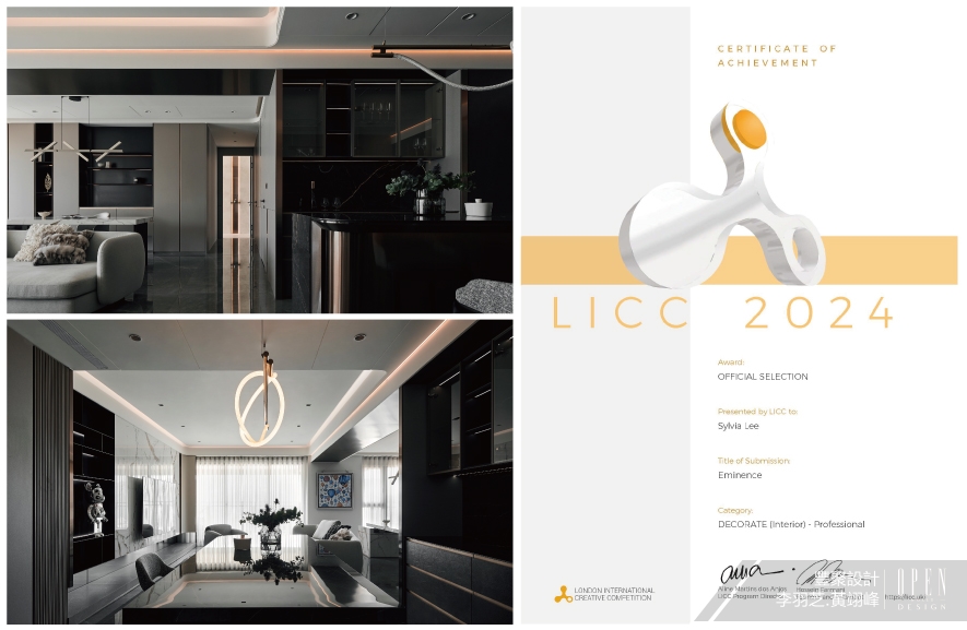 全球指標性設計大獎London International Creative Competition(英國倫敦國際創意大賽,簡稱LICC),是由來自Farmani Group的兩位藝術家Launa Bacon和Hossein Farmani所成立的,於2006年開展至今,已有十九年歷史,每年皆向多國設計好手發出邀請,藉由評選出當中佼佼之作,引領建築、繪畫、影像等11大創作領域齊步向前,參賽作品除了能與各國大將切磋,更能得到將作品展示於世人眼前的大好機會!豐聚設計 設計總監 李羽芝、執行總監 黃翊峰 以沉靜暖灰色調奠定基底,透過質感鍍鈦材質、薄板磚石紋理與玻璃通透感的層次堆疊,於情境光源投射下,蘊生流動光暈,呈顯精緻手藝,打造如精品飯店般的家宅《當代御邸Eminence》,於2024 LICC賽事中出類拔萃,喜迎「Official Selection」榮耀!