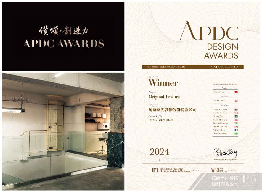 APDC亞太設計中心是室內設計聯合國組織IFI國際室內建築師設計師團體聯盟的全球成員,核心會員由活躍於大中華地區,乃至亞太地區的全球優秀建築師、室內設計師、產品設計師構成。而由該組織發起的APDC AWARDS,自2010年起每年舉行一次,今年已來到第15屆,是亞太地區最重要的獎項之一,曾與全球多個著名設計獎項,並就賽事獲獎作品相互輸送簽訂了友好合作協議。活用案場原始的採光優勢,緯綸室內裝修設計有限公司 屏除隔間設計,於50坪空間內僅規劃8個座位,令自然光無礙穿梭其間,顛覆一般髮廊的擁擠印象,予以來客明朗敞亮的舒心體驗,宜人商空《Original Texture》深受賽事評審團讚許,獲頒「Winner」佳績!