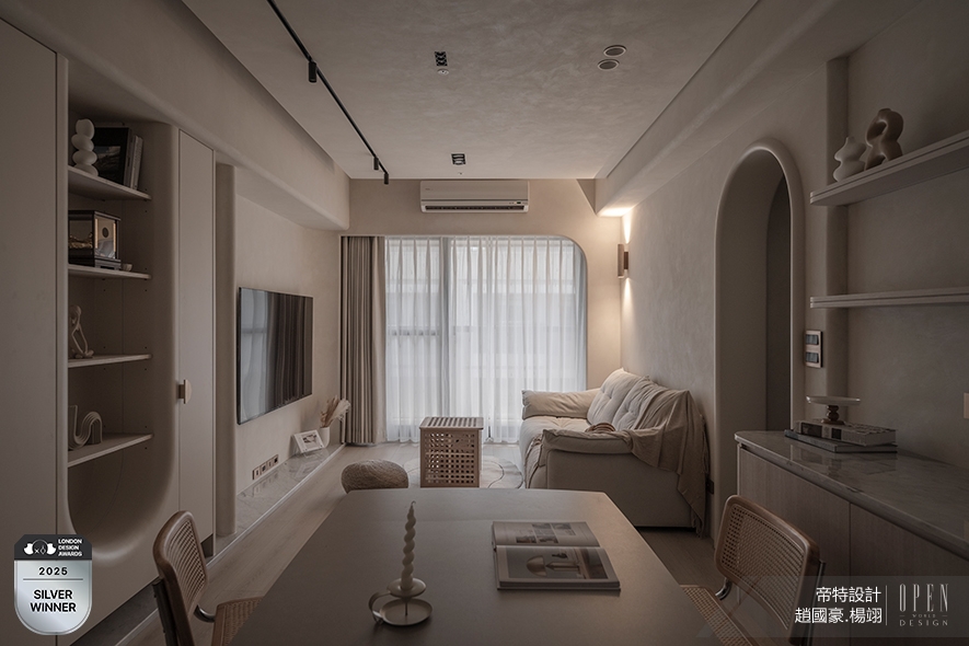 ▲公區天花板有別於常見的單一大圓,改以方整格局搭配弧形收邊樑柱,在保持場域秩序感與方陣結構的前提下,客廳的「U」形展示櫃與對側拱門形成幾何對話,圓弧語彙自然延伸至電視牆面,以溫潤曲面取代傳統壁面的生硬切割,創造連貫而不碎裂的視覺美感。