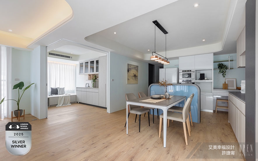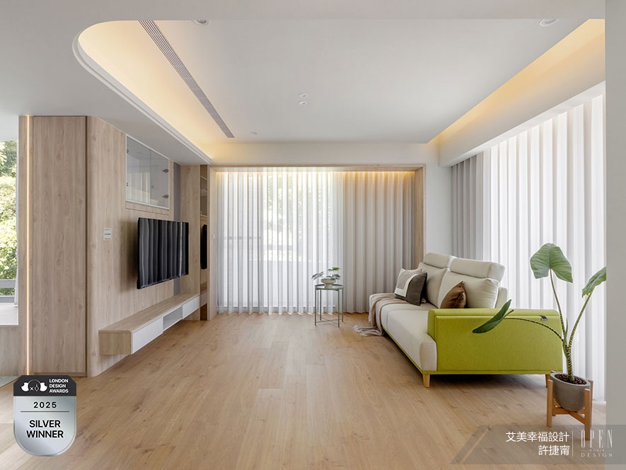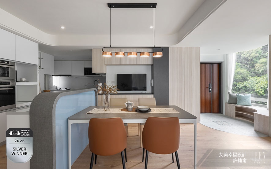 以柔潤曲弧象徵屋主一家的圓滿幸福、藉環繞屋間的和煦木調灌注暖意,艾美幸福設計 設計總監 許捷甯 將家宅作品《清煦》巧心規劃為無壓放鬆的舒適環境,滿足居者們對於「家」的每份想望,熱誠服務態度及清朗溫馨的設計美學,深深觸動本屆賽事評審團,順利摘獲「銀獎」榮耀!