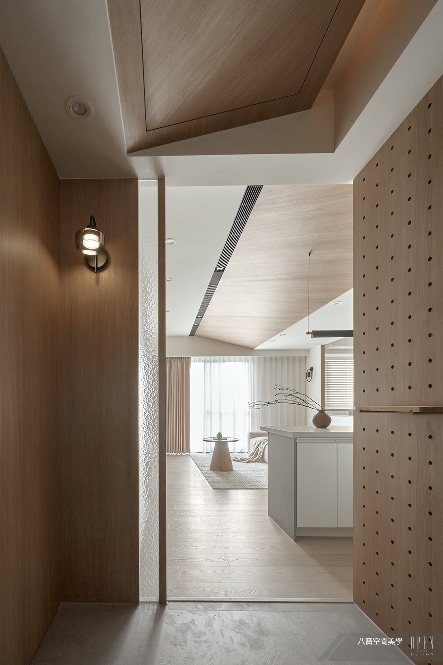 輕踏入室,斜面天花以優雅弧度劃破平淡,與後方開闊客廳形成層次遞進的視覺韻律。玄關處的灰色地坪與室內淺木色地面形成對比,在足下延展出明確的空間界定,引領歸者於此褪下塵埃,步入家的溫暖懷抱。左側柔光壁燈輕柔綻放,與四周溫潤木質相互呼應,營造出卸下疲憊的靜謐角落;對向洞洞板以其靈活多變的收納姿態,將物件化為動態的居家藝術展示,在重組與調整間展現日常的多樣可能。隱藏式儲藏門片悄然融入同色系牆面,弱化實體門扉存在感,使收納機能與空間美學達到平衡,在簡約的畫面連貫中保持整潔有序。