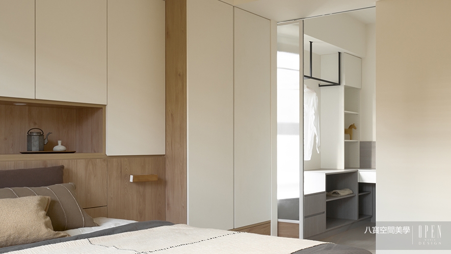 推開臥房門扉,純白與木質在此相遇,輕柔包覆整個空間。窗邊百葉簾片細膩篩濾著日光,將光影切割成一道道平行的韻律,輕柔地鋪陳在素淨的床褥與地板上,為靜謐的私密場域增添幾許生動。床頭後方木色床頭櫃與純白儲物櫃體融為一體,線條流暢如行雲流水,既保持視覺的簡潔純粹,也滿足日常收納的豐富需求。睡眠區與更衣室之間,精巧的對開鋁框門作為空間轉折,開合之間盡顯生活的彈性與從容。