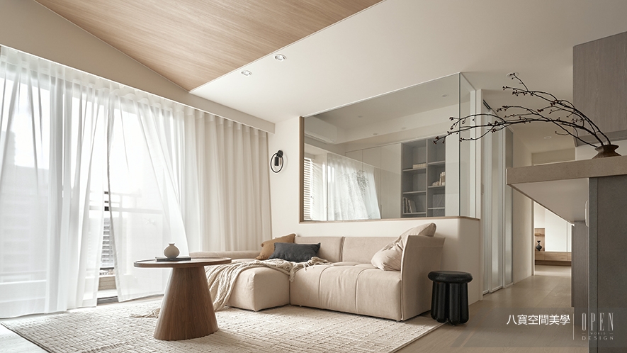客廳中央,卡其色L型布藝沙發以其飽滿柔軟的姿態靜臥一隅,米色編織地毯於其下鋪展開來,織就一方溫柔的憩息之地。沙發後方上側嵌入轉角型玻璃,讓書房與客廳的視線自由穿透,光線在兩者間流動遊走,保留的側牆與下方矮牆則維持著恰到好處的隱私感,在開放與私密之間取得巧妙平衡。