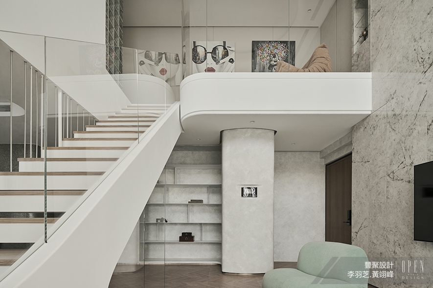 ▲突破傳統樓梯格局,本案將其大方呈現在公領域,藉由懸浮設計、線燈及分別由強化玻璃、鐵件構成的扶手,打造輕盈靈動的視覺重點,維持家宅內視野通透也無形區隔客、餐廳。