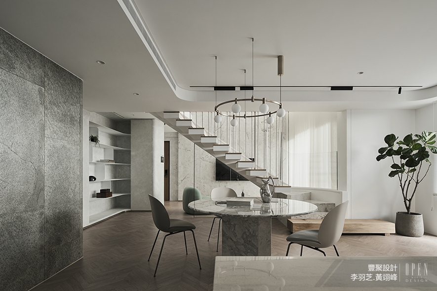 ▲餐廚區壁面鋪貼銀灰石磚,為公領域更添色彩層次,一旁置入圓形石紋餐桌,搭配上方懸掛的圓弧吊燈,共塑圓滿寓意、造就流暢的環形動線,並設置一座方形中島,擴展烹調空間。