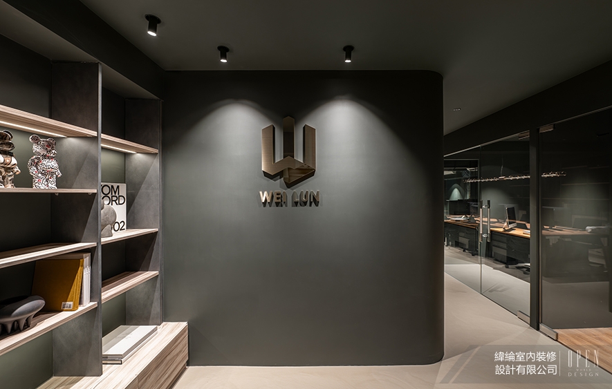 甫啟大門,眼前即見時尚黑底烘托明亮金字的logo牆面,簡約大氣,展現鮮明的品牌辨識度,搭配左側不對稱開放層櫃的優美藏品,無形於造訪者心底烙印精緻質感與品味的形象,主牆邊緣則設計圓角造型,柔化大面暗調的量體感之餘,輕盈導引視線深入場域。轉入室內,整齊有序的透明玻璃既清楚區劃辦公區域,更為深色主調的空間開闊視覺,任由人工照明及天然光線徜徉屋間,工作者也得於煦光的洗禮下盡享敞亮舒適感,沉澱身心專注投入工作。