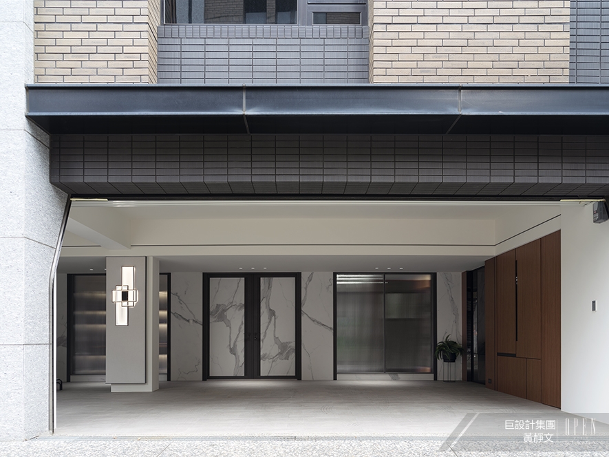 身披在外奔波一日的疲倦,終於盼得歸宅之刻。在徐徐升起的大門後方,一盞方正量體交錯的造型壁燈作為指引方向之燈塔,與後方長虹玻璃隱約透出的柔和暖光,相偕點暖本已疲憊的心,並將其轉為對稍後推開家門時,最愛的家人們一聲聲溫暖招呼的期盼。
