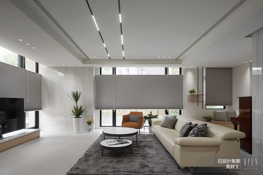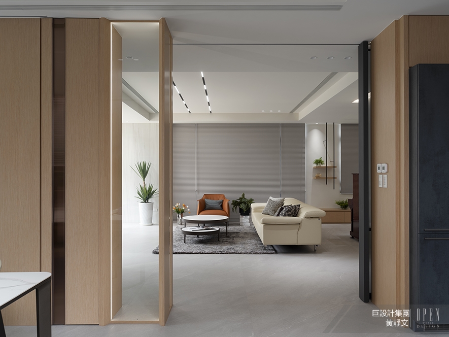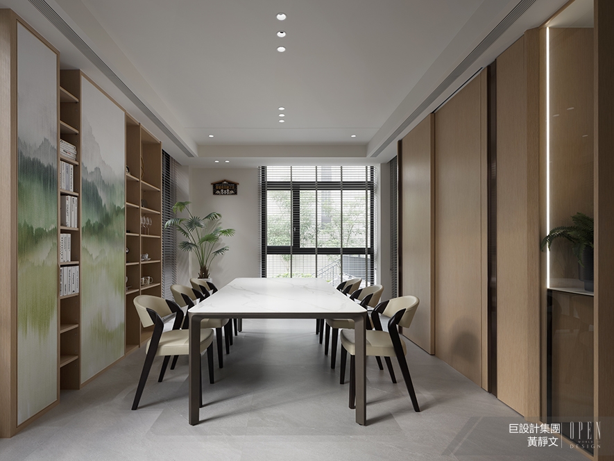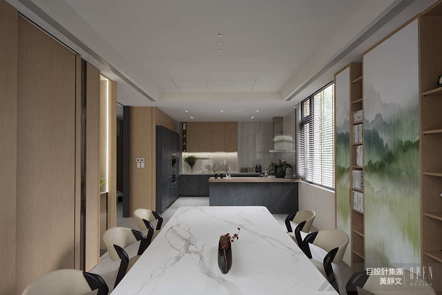 巨設計集團 執行長 黃靜文 始終以人們的生活體驗為設計核心,透過貫穿全案的淺調基底,搭配開放式公區及充裕採光的通透明亮,打造開闊無壓的家居環境,並將餐廳結合書房功能,貼合居者三人共享閱讀的需求之餘,藉由整體採用的大量實木、大理石,輔搭多處選置的盎然植栽、山景畫作,圍塑和緩放鬆的溫馨氛圍,成就生活機能交融自然美學的理想居所,亦契合品牌「設計源於生活,生活創造設計」的創作初心。