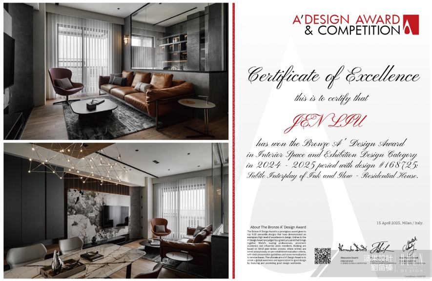 洆果設計 設計總監 劉笛榛 以簡約現代的設計風格為基調,利用通透的玻璃窗引入自然光,配合高效節能LED燈具和綠建材,營造出健康、永續的家宅作品《潤墨輕光》,榮獲2024-2025年度 A' Design Award銅牌,為品牌增添無限榮光!關於義大利A' Design Award