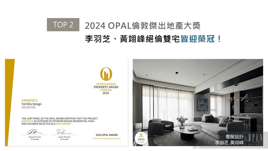 OPAL(英國倫敦傑出地產大獎)力求各地最富創造力、社會影響力與永續性的設計方案。李羽芝、黃翊峰總監運用線條與異材質拼接,輔搭中性色調,造就契合屋主氣質美邸《當代御邸Eminence》;作品《Rosy-fingered微粉寓所》以玫瑰色綴點奶茶色系,營造夢幻景緻,刻畫獨屬居者的歸宿。贏獲本屆賽事「Winner」及「Honorable Mention」獎項,為品牌成就新添一筆榮耀!