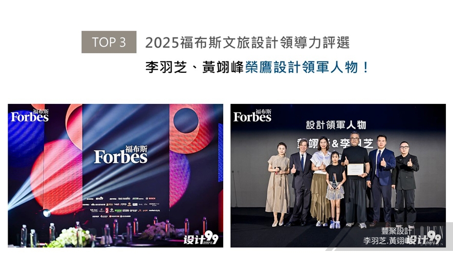 2025福布斯中國文旅設計領導力評選,由福布斯中國分部聯合設計平臺「設計99」共同推出,旨在表彰於文旅、設計領域做出傑出貢獻的人物與企業。此次評選中,李羽芝、黃翊峰總監勝出重圍,是因為完美契合福布斯所倡導的「領導力」內涵,為所有客戶提供兼具「文化底蘊、生活美學、品質工藝、情感溫度」的頂級居住體驗,展現強大的設計引領能力!