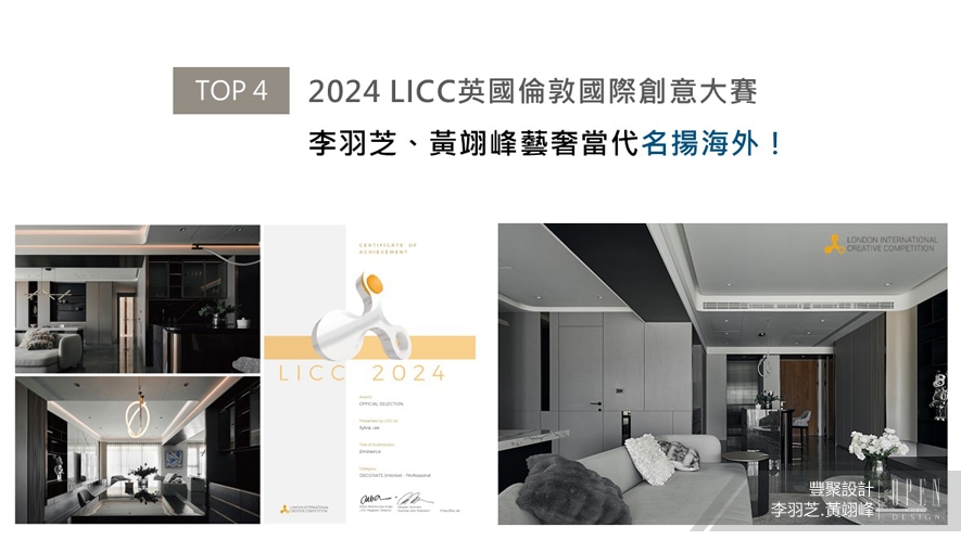 LICC(英國倫敦國際創意大賽),於2006年開展至今,已有十九年歷史,藉由評選出當中佼佼之作,引領建築、繪畫、影像等11大創作領域齊步向前。李羽芝、黃翊峰總監以沉靜暖灰色調奠定基底,透過質感鍍鈦材質、薄板磚石紋理與玻璃通透感的層次堆疊,打造如精品飯店般的家宅《當代御邸Eminence》,於2024 LICC賽事中出類拔萃,喜迎「Official Selection」榮耀!