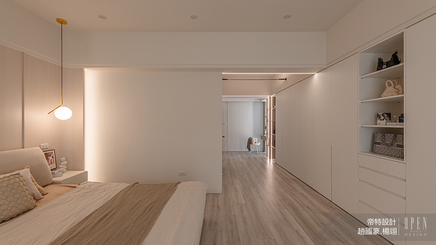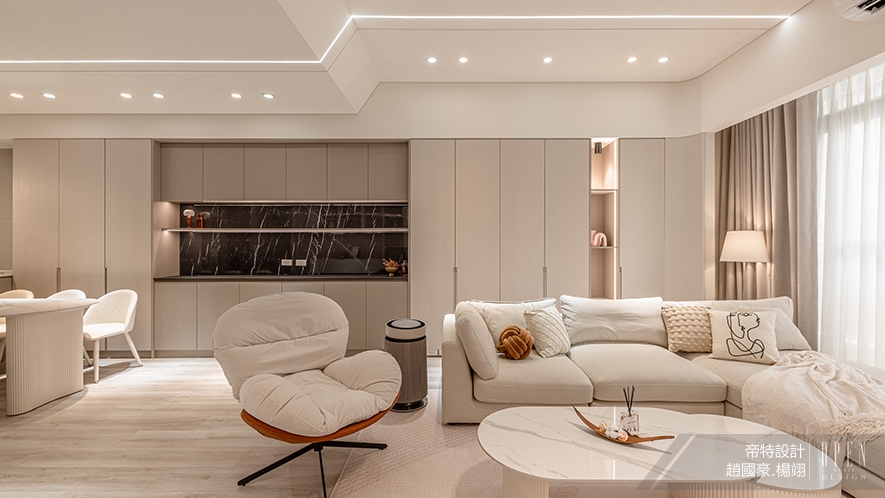 帝特設計 品牌總監 趙國豪、設計總監 楊翊 秉持對當代居住品質的深刻理解,透過暖米白色、淺灰與奶茶色系的細膩鋪陳,搭配多處間接照明的光影暈染,創造如雲朵般的柔和包覆感;之中以圓弧造型軟裝元素點綴,以及乳膠漆、石紋、木質等多元材質的對話,注入生活的溫潤質感;同時藉由流暢的開放式動線、展示與收納並重的櫃體規劃,將日常需求轉化為空間美感的一部份,成功演繹機能美學與居住溫度的和諧共鳴,實現設計團隊對於「無壓的溫柔、靜謐的日常」的作品期許。