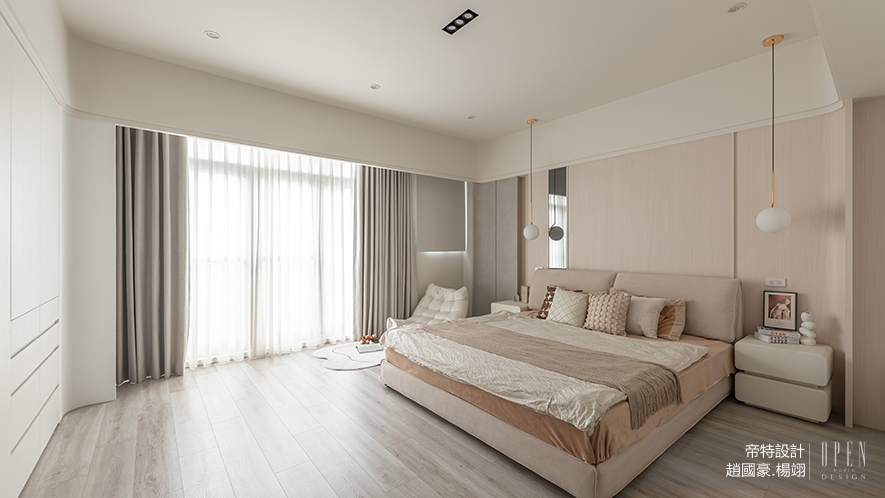 床頭主牆以幾何分割的立體造型板材為視覺焦點,淺灰與奶茶色調的垂直色塊依序排列,之間嵌入鏡面材質延伸視覺深度並反射光影,增添流動的色彩層次感,而間接暖光更沁入恬淡氛圍,與床頭兩邊如明月散發柔和光暈的簡約球形吊燈呼應,圍塑舒適宜人的夜間氛圍;日間大面落地窗提供充足光線,窗邊純白懶人沙發無聲邀請居者在午後時光中沉浸於書頁間的寧靜,為忙碌日常撫平浮躁的心緒、重新找回內心的安寧與自在。