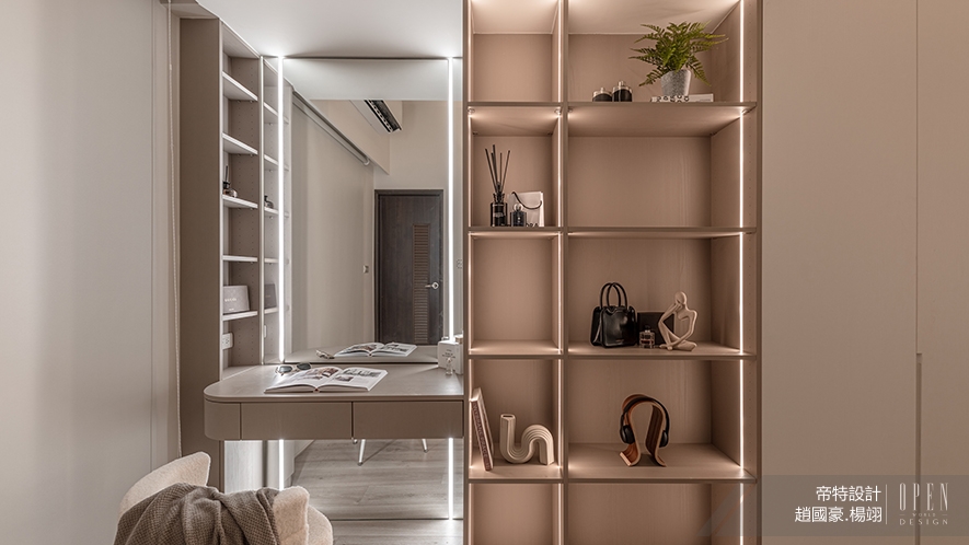 床尾嵌入式收納櫃體採用無把手設計,深化俐落簡約的視覺效果;旁側梳妝區開放展示格架錯落有致地陳列精品小物,便於日常拿取,另外鑲嵌的LED燈帶如絲綢般勾勒櫃體邊緣,注入光韻層次,每一層都彷彿藝廊般的陳設美學,盡展主人的品味生活。