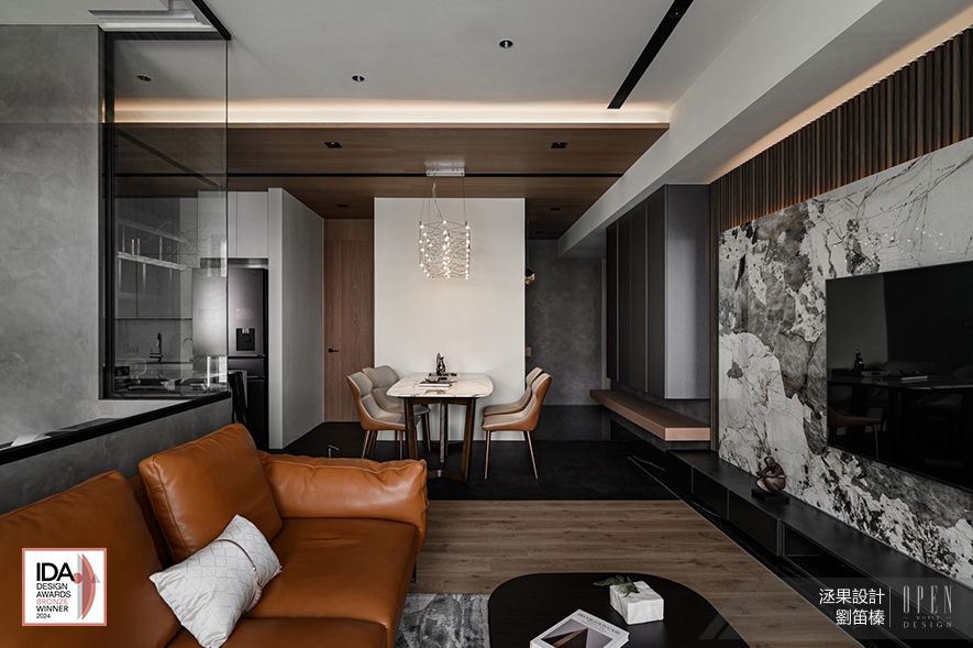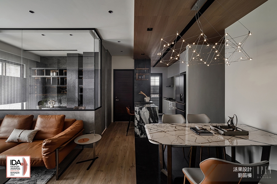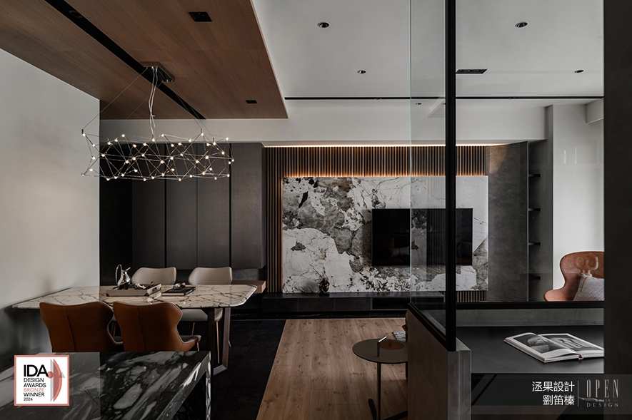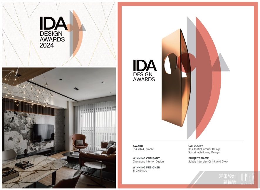 巧妙運用案場的優質地理條件,洆果設計 設計總監 劉笛榛 劃設大面玻璃門窗及清玻隔間牆,搭配公領域的開放式設計,讓戶外河岸景觀自在淌入屋中所有角落,造就廣納天地為生活美景的開闊舒愜宅,作品《潤墨輕光》的澎湃意境驚豔一眾評審,獲頒本屆賽事「Bronze」出色佳績,令細膩獨到的品牌美學再次閃耀國際!關於美國IDA國際設計大獎