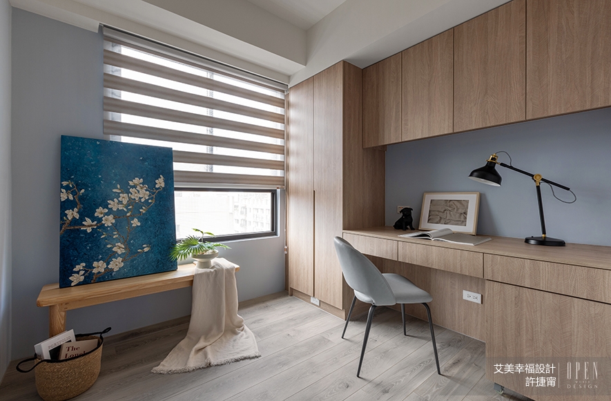 ▲書房以簡潔設計打造寧靜專注場域,貼合業主偶爾居家辦公的機能所需,而書桌區外預留的大片空間,則顧及親友來訪、未來家庭成員增加等可能性,令此處成為功能多元的彈性場所。