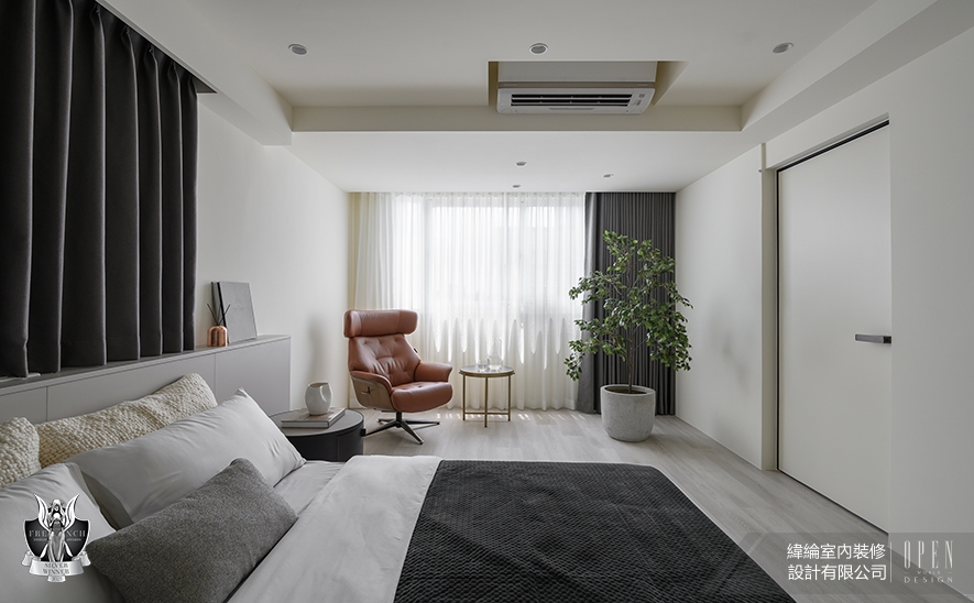 ▲主臥延續公領域的簡約風格,以灰白主調搭配橘色皮革休閒椅,營造寧靜氛圍,左側自然光從落地窗灑入,搭配閱讀區植栽,為空間注入溫度與生命,讓靜謐的私領域,成為與自己對話的休憩日常。