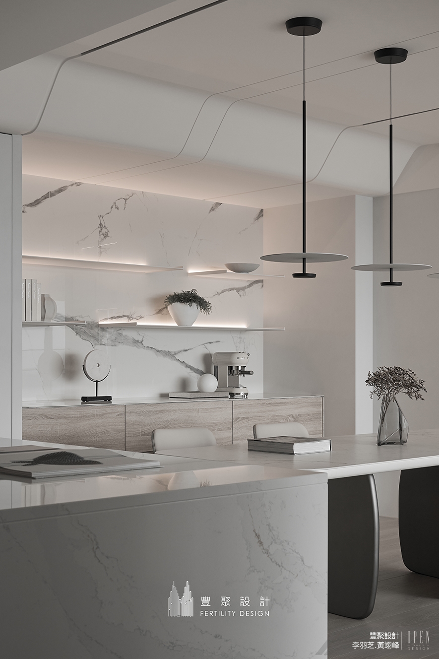 圓角餐桌與圓盤造型吊燈相互呼應,增添柔美婉約之感。一旁牆側採用淺色木質櫃體與純淨白色檯面,兼顧實用收納機能,並與同色系餐桌及吧檯達到視覺平衡,讓每一次的用餐時光,不只是日常,更是質感生活的延伸。