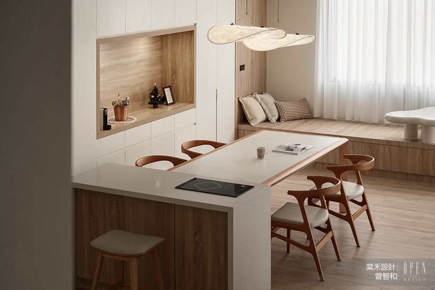 開放式的餐廚區以嵌入IH爐的白色中島為軸心,讓冬日圍爐、日常輕食都能於此輕鬆完成;木質餐椅以簡約線條呼應空間的無印調性,與純白檯面形成和煦連結,圍塑和諧自然之感;餐桌上方雲朵般的吊燈懸浮,拂過輕柔光暈,映照一家人圍坐共餐的溫馨時光。