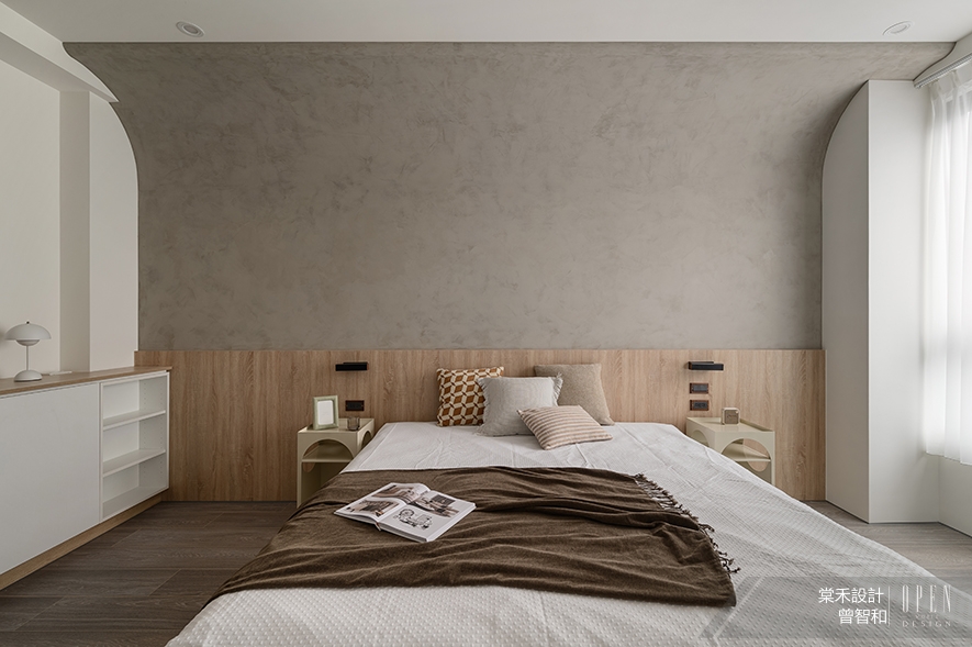 延續一室素淨的木質調性,主臥以輕盈曲線開展空間序章,巧妙化橫樑的突兀感為優雅的曲面語彙。天然的木紋床頭板如大地般沉穩厚實,襯托灰白色調牆面,造就寧靜致遠的休憩氛圍。兩側的圓弧造型床頭櫃,以幾何線條勾勒出柔美輪廓,上方搭配黑色壁燈,更顯靜雅沉穩,編織出一方安適的夢境之所,伴隨居者夜夜好眠。