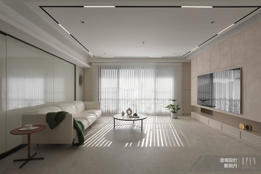 本案為四口之家的溫馨居所,澄境設計 設計總監 鄭抿丹 以圓弧作為空間主軸,在入門處巧妙勾勒櫃體的轉折,讓玄關與客廳之間的過渡更為流暢,形成和諧的韻律感。曲線不僅柔化長形格局的剛硬線條,更將電視牆與櫃面邊緣串聯,讓空間在素淨的淺色基調中,呈現出輕盈而詩意的生活氛圍。此外,為實現屋主對安全無毒空間的期待,設計團隊特別選用無甲醛建材與礦物塗料,從源頭把關空氣品質,創造舒適的綠色居住環境,以細膩的關懷守護全家人的生活品質與健康。