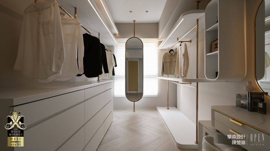 ▲主臥弧形木作床背板內藏暖黃間接光源,可作夜燈並營造舒眠氛圍;更衣室整合衣架、抽屜櫃與梳妝臺,並以伸展臺為概念發想窗畔淺金鏡面,提供住者一展美學的時髦舞臺。