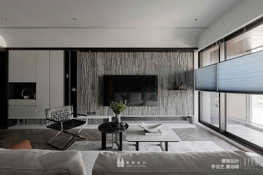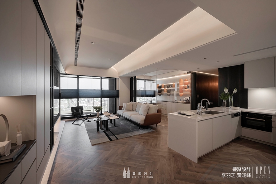 豐聚設計 設計總監 李羽芝、執行總監 黃翊峰 活用大片深邃沉靜的木色,隨場域深入逐步開闊為輕柔淺調,醞釀心境自沉澱轉為放鬆的療癒氛圍。足下,人字拼木地坪飄逸文藝氣息,與石條肌理壁面揉和出觀感豐富的質感層次,輔搭曲弧天壁灑落的柔和間接光照,替屋宅增添和煦無壓的溫情暖意,亦在每寸片隅之間,真切訴說雍雅品味中獨屬屋主的生活物語。