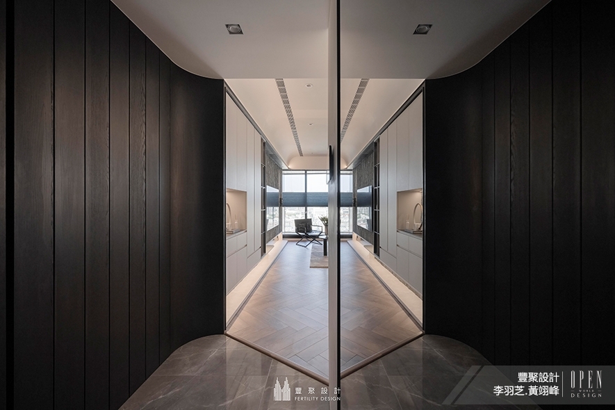 玄關立面拼貼層遞有序的深色木皮,讓溫潤寧靜感迎接歸者,徹底平復在外繁忙一日的浮躁心境;對側,頂天立地的落地鏡牽引光線,將所見之處的景深悄然拉長,而光影反射間的異材細節烘托,展露神秘高雅氣質,鋪陳一段安定細膩的入室前奏,同時倒映木質的暗影與公區的明亮,使色彩對比展開漸次輕盈的明暗層次,進一步強化屋內空間的敞亮清透。