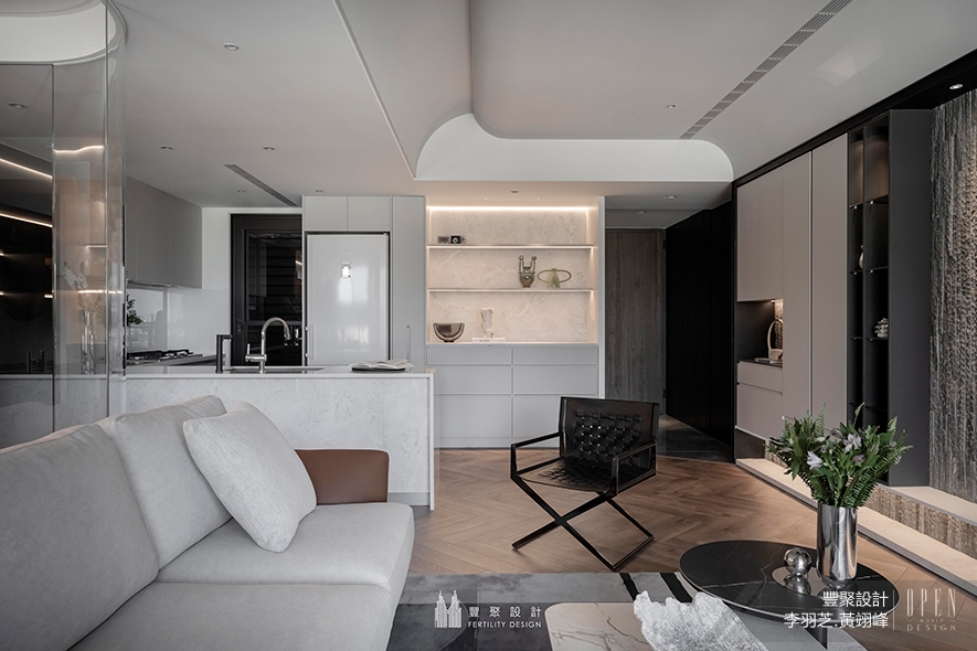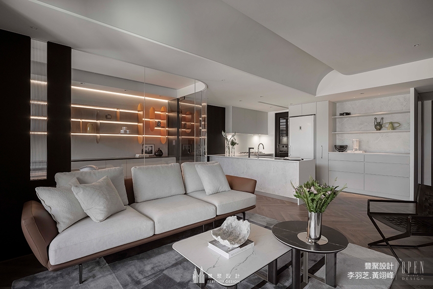 秉持人文核心的設計思維,豐聚設計 設計總監 李羽芝、執行總監 黃翊峰 在此案中巧運細膩工藝手法、嚴選多元迥異材質,讓空間中的每個細節,盡數成為業主美學品味的化身,描繪一處飽含當代風情的奢華雅境;同時顧及人們日常所需,構築動線流暢、機能便捷的自適場域,供予業主一家精緻實用的質感生活天地,也達至品牌「化居所為屋主生活態度及熱愛風貌延伸」的溫馨期許。