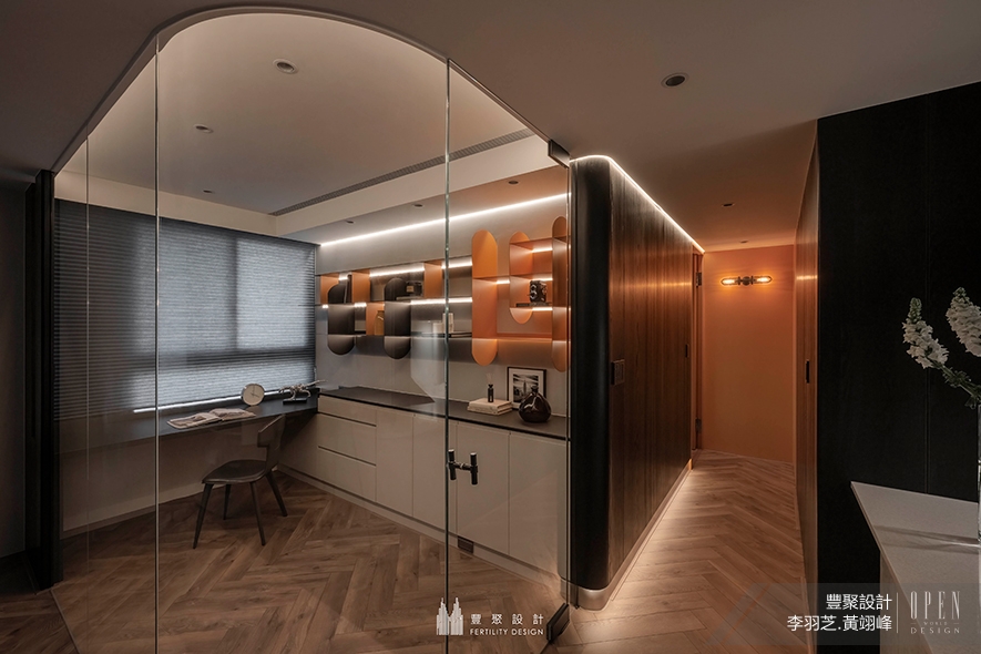 回應住者居家辦公所需,設計團隊由重劃格局下手,將一房次臥拆除後,設置曲弧清玻隔間牆,令書房由一處封閉的立方體,轉為精品櫥窗般的文雅角落,使屋主得在具隔音的獨立空間工作,又能保有一覽公領域細緻設計的寬闊視野;內部以少量的黃黑雙色鐵件精琢俐落端景,如同透明畫框裡綻放的抽象色塊,於沉穩中添入一抹時髦亮意,成就一處自在優雅的閱讀與辦公之所。