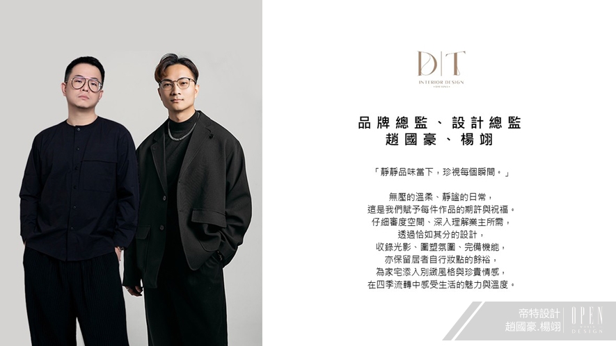 帝特設計的趙國豪、楊翊總監,攜手將公司從創建初期的青澀,短短四年便滋養為現今茁壯煥光、廣受好評的傑出設計品牌。兩人以沉穩的個性,加之跳脫傳統框架的嶄新思維,腳踏實地積累專業經驗及優良口碑,只為讓帝特獨有的溫暖設計,成為每位使用者改善生活的無形助力,創造融入業主美學及人文溫度的專屬空間,內容豐富的專訪受PChome上刊推薦!