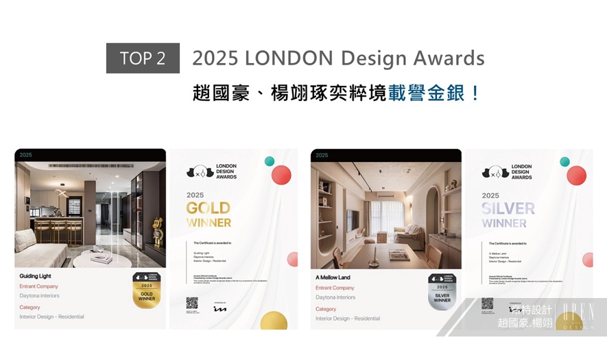 以精湛工藝詮釋當代美學,帝特設計趙國豪、楊翊總監於《琢奕》巧妙融合黑白灰三色與奶茶暖調,運用鏡面反射與線性光帶,為年輕業主打造處處皆美景的輕奢居所;而《粹境》則以侘寂美學為本,透過柔和曲線與多層次光影設計,營造如雲朵般輕盈悠然的生活場域。兩件作品分別贏獲2025 LONDON Design Awards「金獎」與「銀獎」榮耀,印證團隊在空間美學上的卓越成就!