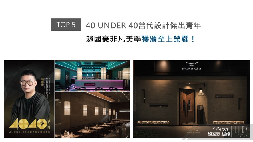 帝特團隊以趙國豪、楊翊總監為核心領袖,多年來持續懷抱對室內設計的熱愛及重視客戶體驗的服務熱誠,並注入一件件絕美創作中,使其滿盈理性及感性並融、美觀不失實用性的設計巧思;本屆40 UNDER 40,品牌總監趙國豪代表帝特設計參與賽事,順利脫穎而出,榮登「當代設計傑出青年」2024-2025年度榜單,為屢獲國際大獎肯定的品牌佳績再添一筆耀眼光采!